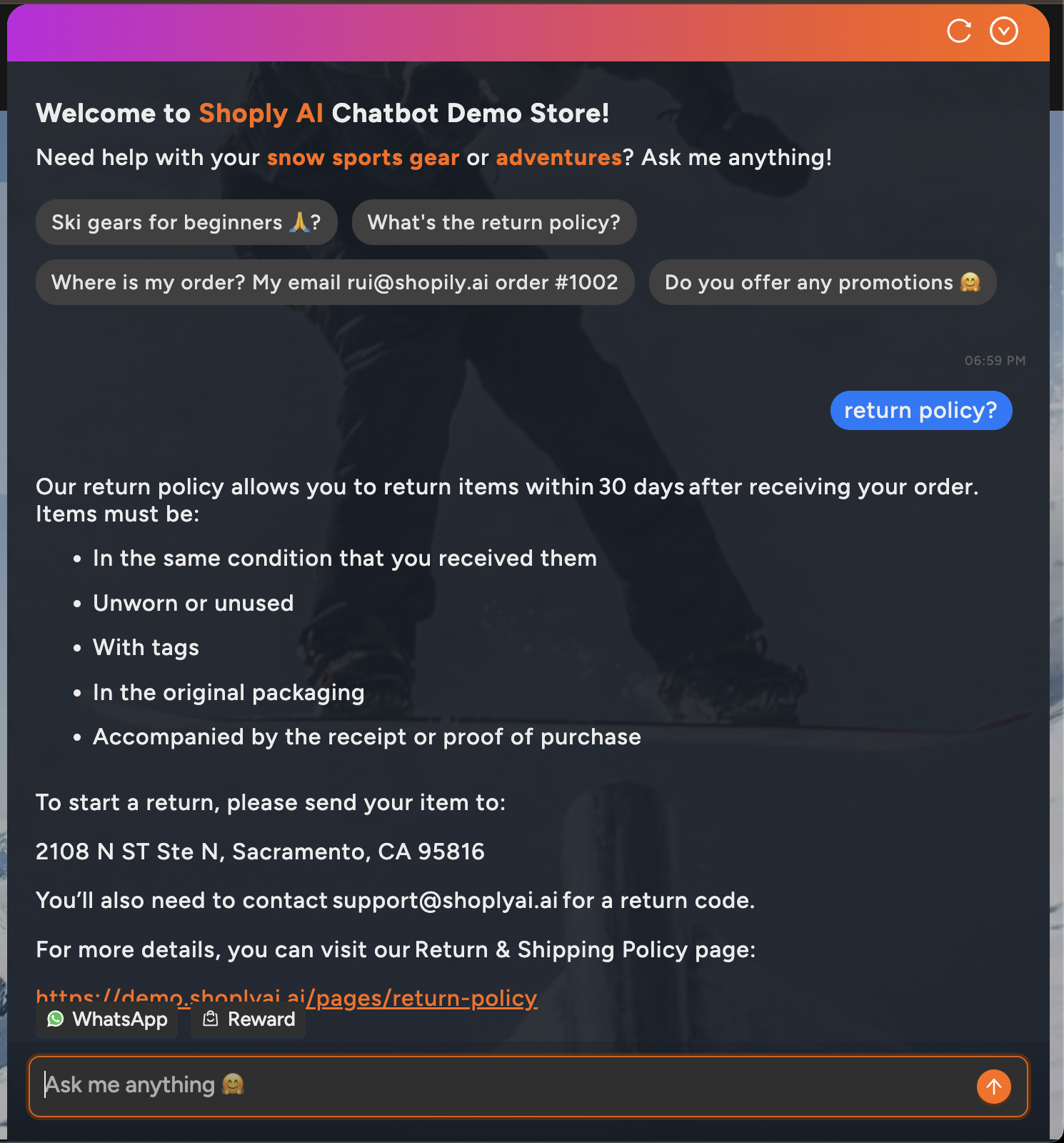 Shoply AI generates return policy answers dynamically from your current policy pages, not from cached text that may be out of date. When a customer asks about returns, the chatbot reads the policy document as it exists now and responds accordingly. If you update your policy page, the chatbot’s answers update with it automatically, with no manual retraining needed.