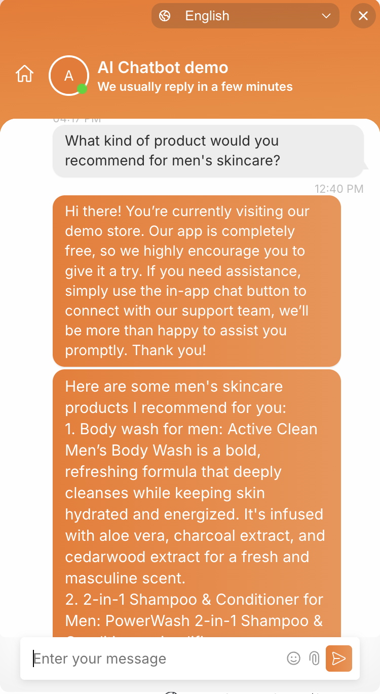 - Multilingual self-service: Track order & search FAQ, Social redirect buttons