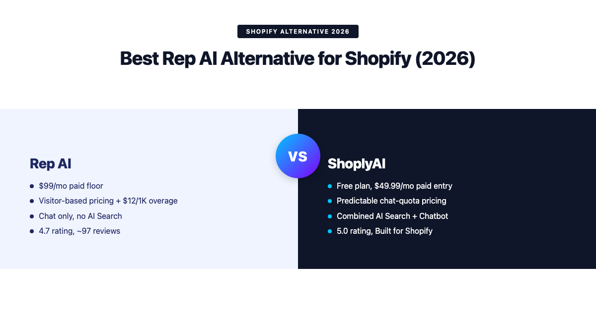 ShoplyAI is the only Shopify-native app combining AI Search + Chatbot. Rep AI’s visitor-based pricing is the structural reason high-traffic stores look for alternatives, and the table shows what each alternative trades off. For the wider chatbot category context, our best AI chatbots for Shopify in 2026 guide groups these tools by use case.