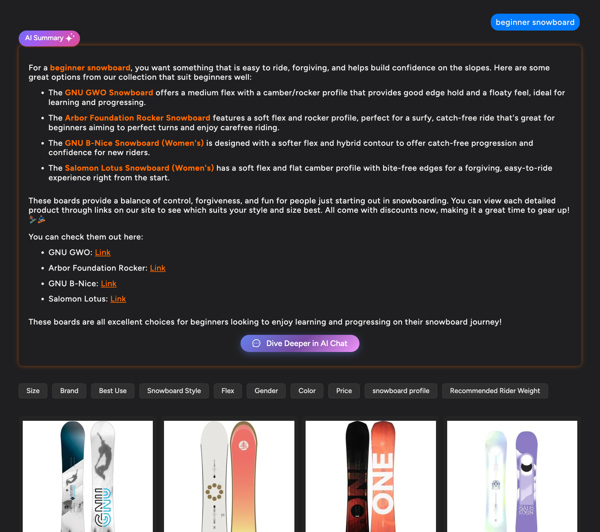 The “Dive Deeper in AI Chat” button opens the chatbot with the search context already loaded, so customers can ask follow-up questions without starting over.